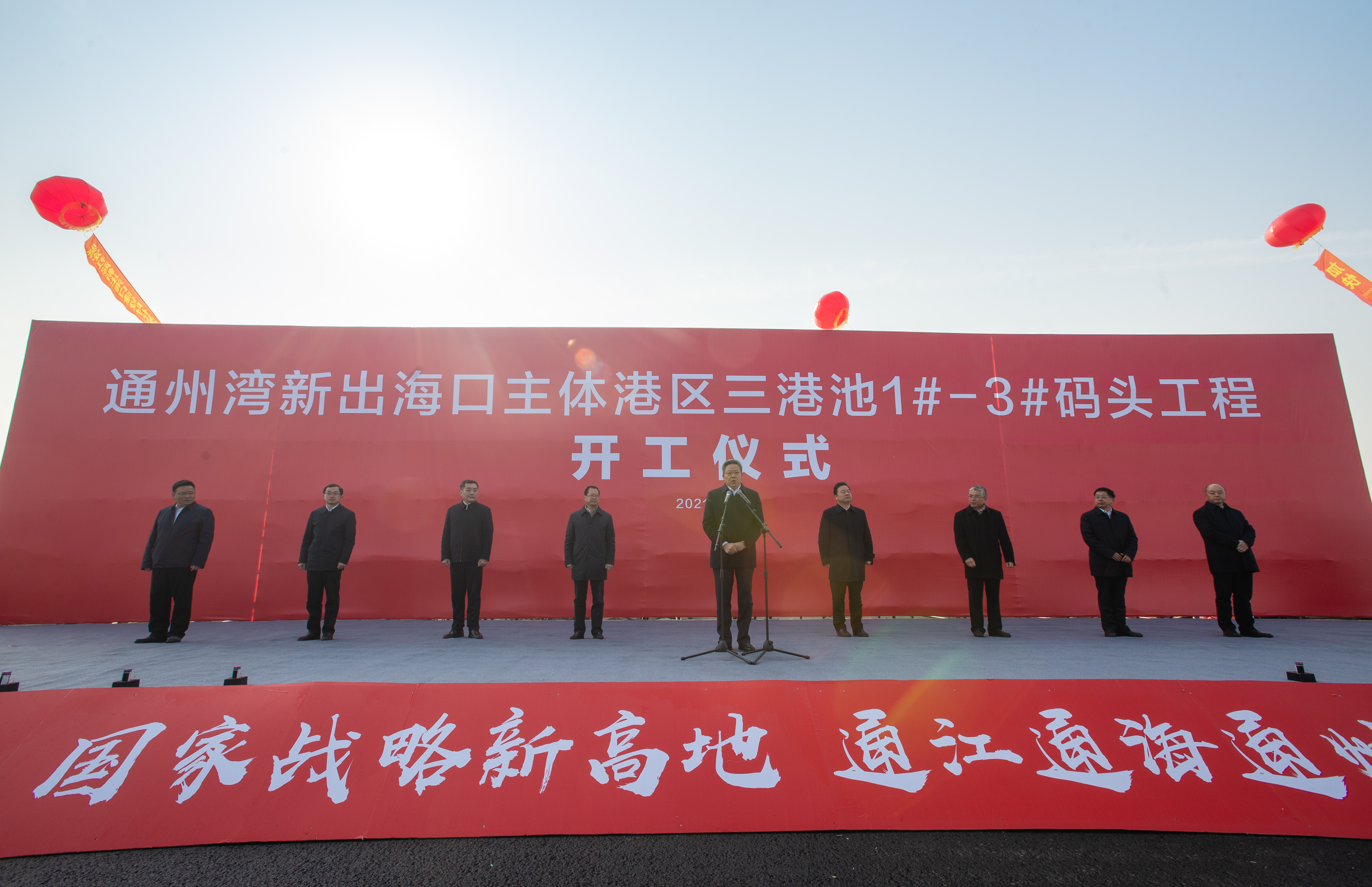 2021年12月30日上午,通州灣新出??谥黧w港區(qū)三港池1#-3#泊位碼頭工程正式開工,標志著通州灣主體港區(qū)正式邁入“深水大港”時代。南通市委副書記、代市長吳新明宣布開工。南通市委常委、常務副市長、通州灣港口開發(fā)建設委員會主任、通州灣示范區(qū)黨工委書記陸衛(wèi)東,南通市人大常委會副主任陳俊,市政協(xié)副主席金元,市政府秘書長凌屹、副秘書長王國平,通州灣示范區(qū)黨工委副書記、管委會主任施宏杰,中交第三航務工程局有限公司董事長王世峰,南通港(港口)集團有限公司黨委書記、董事長朱玉強,黨委副書記、總經理、副董事長劉建出席活動。通州灣港口開發(fā)建設委員會常務副主任施渠平主持開工儀式。